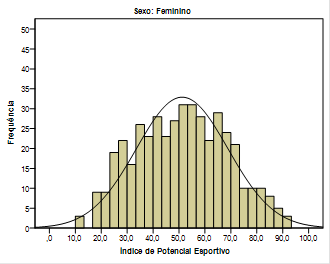 O Índice de Potencial Esportivo na amostra apresentou aderência a distribuição normal de probabilidade – Figura 1. A média e o desvio-padrão (mínimo – máximo) dos meninos foi de 53,1 ± 17,3 (6,2 – 94,2) e das meninas foi de 51,2 ± 17,7 (11,0 – 91,1). Nos meninos, observou-se uma correlação positiva e estatisticamente significante entre o Índice de Potencial Esportivo e o escore Z do %EAP (r = 0,14; p = 0,001; n = 554), sugerindo que meninos avançados biologicamente teriam maior potencial esportivo. Porém, sob o ponto de vista prático, o percentual de explicação da maturação sobre o potencial esportivo nos meninos foi pequeno (r2 = 0,02%). Isto significa que apenas 2% da variância no potencial esportivo seria explicada pela maturação somática. Nas meninas, não foi observada correlação estatisticamente significante entre a maturação e o potencial esportivo (r = -0,09; p = 0,07; n = 390), sugerindo que o potencial esportivo das meninas independe da sua maturação biológica.