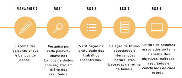 No PsycINFO, ao buscar pelas palavras-chave na primeira fase foram encontrados 2130 artigos, sendo apenas 86 gratuitos e sete com títulos relacionados. Dos sete artigos, nenhum tratava especificamente da intervenção naturalista baseada na rotina da família de jovens com autismo e DI. A maioria estava direcionada a outras deficiências e/ou focados na primeira infância. No PePSIC[1], somente dois artigos avançaram até a segunda e terceira fases, pois tinham acesso aberto e título.