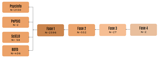 Trata-se de uma revisão de literatura, pois, com base na definição colocada por Flor et al. (2021), envolve uma busca sistemática, análise e descrição de um determinado assunto ou campo de conhecimento com o objetivo de estabelecer uma maior delimitação sobre um campo de pesquisa. Com base nisso, foram planejadas quatro fases (Quadro 1), cuja primeira consistiu na busca de palavras-chave associadas à temática da pesquisa em quatro grandes bancos de dados de trabalhos científicos: PsycInfo, SciELO, PePSIC e BDTD. A escolha de utilizá-los para realizar buscas confiáveis de trabalhos relacionados à psicologia é fundamentada na sua especialização, abrangência, atualização e confiabilidade, o que os torna recursos reconhecidos para pesquisadores, estudantes e profissionais da área de psicologia.
