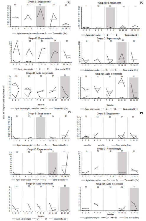 Em cada grupo, a maioria das categorias descreve comportamentos coerentes com a proposta do DUA e estratégias favoráveis ao desenvolvimento de repertórios verbais, que se buscava aumentar em frequência com a intervenção. As demais descrevem outros comportamentos da professora em sala de aula, inconsistentes com o DUA, os quais não foram sistematicamente focalizados na intervenção, mas se esperava que reduzissem em frequência como consequência da aprendizagem de estratégias alternativas (linhas sombreadas na Tabela 2).