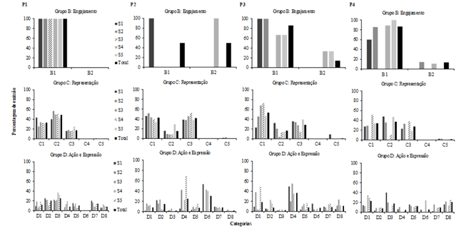 Categorias de análise - Comportamentos das professoras: As categorias que descrevem os comportamentos das professoras estão organizadas em quatro grupos, conforme a Tabela 2. As categorias dos grupos A, B, C e D são mutuamente exclusivas, com exceção de C-3 e C-4 que poderiam se sobrepor.