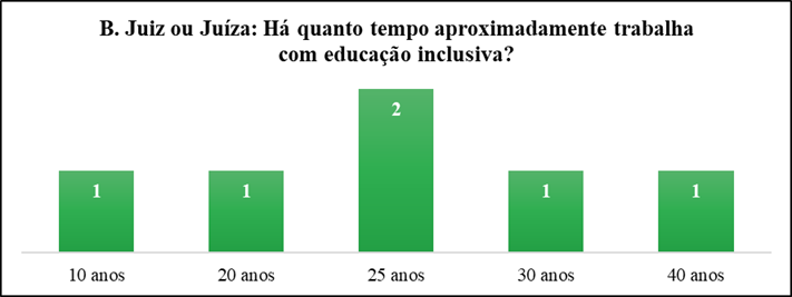 No Gráfico 1, constata-se que 5 dos 6 juízes participantes possuem, pelo menos, 20 anos de experiência em educação inclusiva.