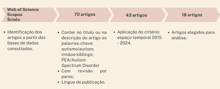 A pesquisa foi conduzida com recurso a palavras-chave em Português Europeu e do Brasil e Inglês, nomeadamente, Português: PEA OU autismo E irmãos E relações; irmãos E PEA E adolescência; Inglês: ASD OR autism spectrum disorder AND siblings; siblings AND ASD AND adolescent. Os artigos foram pesquisados nas bases de dados internacionais Web of Science, Scopus e Scielo, reconhecidas pela sua relevância e rigor científico. Os critérios de inclusão definidos para a seleção dos artigos foram os seguintes i) idioma: artigos escritos em português do Brasil ou Português Europeu e/ou inglês; ii) temporalidade: artigos publicados entre 2015 e 2024, visando uma atualização dos últimos 10 anos; iii) qualidade científica: artigos com revisão por pares; iv) relevância: estudos relacionados diretamente com a temática das relações entre irmãos com e sem PEA. Foram definidos os seguintes critérios de exclusão: artigos científicos sem revisão por pares, escritos noutras línguas que não o português Europeu ou do Brasil e/ou Inglês e que não foram publicados no período temporal definido (2015 a 2024).