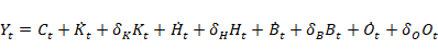 O resultado do produto (ou da renda) tanto pode ser utilizado para consumo quanto transformado em capital físico (K), competências ou habilidades (H), biofísico (B) e social (O):