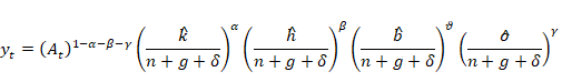 Outro argumento que reforça a proposta aqui apresentada é o fato de que o mais importante indicador de capital humano - o IDH - é um índice composto, formado, além da renda, pelas variáveis educação e saúde. Vamos então supor que, para um determinado ente federativo, no tempo t, seu produto, Yt, depende de insumos, a saber: do trabalho bruto (Lt) e de cinco outros tipos de fatores acumulados: Kt, Ht, Bt, Ot e At. Os cinco fatores de produção se combinam para produzir um produto sob a hipótese de retornos constantes de escala (RCE) e na forma Cobb-Douglas[2]: