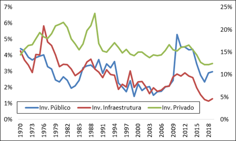 De acordo com Guimarães e Freitas (2019), o Brasil investiu, ao longo das últimas décadas entre 2% e 2,5% do PIB em infraestrutura. Entre a década de 1970 até os anos 2000, os investimentos em infraestrutura foram reduzidos: passaram de uma média de 5,4% do PIB na segunda metade dos anos 1970; para 2,2%, em média, durante os anos 1990. Este resultado está fortemente associado à redução de gastos do setor público. Com efeito, o investimento do setor público caiu de 3,7% nos anos 1970 para 1,2% do PIB na década de 2000, sendo que, no mesmo período, o investimento do setor privado caiu de 1,3% para 1,0% do PIB (gráfico 1).