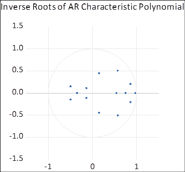 Conforme se observa, as raízes Inversas dos polinômios característicos dos processos autorregressivos dentro do círculo unitário. Desse modo, o modelo aqui especificado pode ser considerado válido.