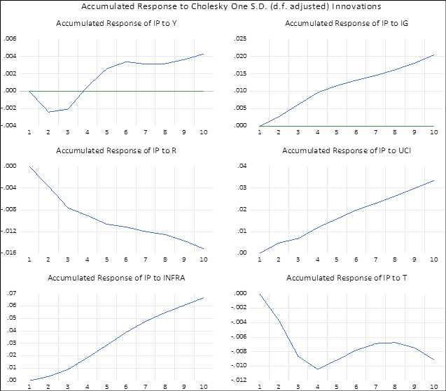 A função impulso-resposta mostra que: i) efeito de um choque isolado positivo na variável PIB, faz com que o investimento privado caia durante os três primeiros anos, para então se tornar positivo ao longo dos anos seguintes (ou seja, a longo prazo o efeito é positivo); ii) o efeito de um choque positivo isolado no investimento público faz com que o investimento privado aumente ao longo dos anos subsequentes (isto é, há complementariedade entre o gasto público e o investimento do setor privado); iii) o efeito de um choque positivo isolado na taxa de juros real faz com que o investimento privado caia substancialmente ao longo dos anos subsequentes; iv) o efeito de um choque positivo isolado na utilização da capacidade instalada faz com que o investimento privado aumente ao longo dos anos subsequentes; v) o efeito de um choque positivo isolado em infraestrutura faz com que o investimento privado aumente ao longo dos anos subsequentes e; vi) o efeito de um choque positivo isolado na carga tributária faz com que o investimento privado se reduza ao longo dos anos subsequentes.