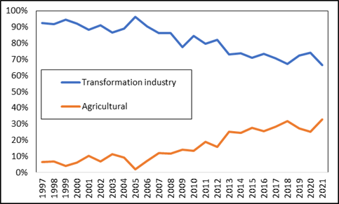 Figure 1 – Participation of the processing industry and agriculture in RS exports between 1997 and 2021