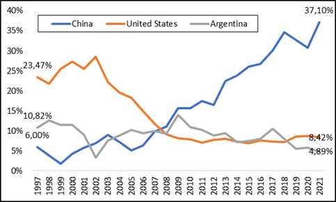 Between 1997 and 2008, the US was the main destination for exports from the state of Rio Grande do Sul. However, after the 2008 financial crisis, China became RS's main trading partner. Currently, China represents 37.10% of the total exported by the state; while the USA – which once represented more than 30% of the contingent exported by RS – in 2021, accounted for 8.42% of Rio Grande do Sul exports. As for Argentina, in 1997, the neighboring country was responsible for 10.82% of the total exported by the state, while in 2021, this number was 4.89% (figure 2).