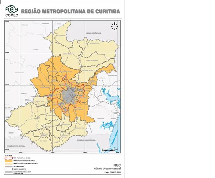 [11] Municípios que compõem o ACP/NUC: Almirante Tamandaré, Araucária, Balsa Nova, Bocaiúva do Sul, Campina Grande do Sul, Campo Largo, Colombo, Contenda, Curitiba, Mandirituba, Piraquara, Quatro Barras, Rio Branco do Sul e São José dos Pinhais.