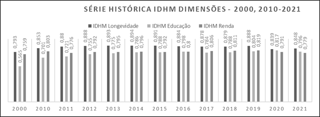 O cálculo do IDHM considera três componentes: IDHM Longevidade, que concerne a expectativa de vida ao nascer; IDHM Educação, referente a escolaridade da população adulta e o fluxo escolar da população jovem; e, IDHM Renda, relativo à renda per capita. O índice é calculado pela média geométrica – raiz cúbica da multiplicação dos três IDHMs (IPEA, 2014).