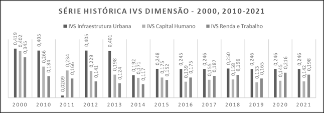O IVS[4] é um índice sintético constituído por três subíndices que determinam a promoção das condições de bem-estar da população, quais sejam: IVS Infraestrutura Urbana (acesso a serviços de saneamento básico e mobilidade urbana); IVS Capital Humano (inclusão social dos indivíduos); e, IVS Renda e Trabalho (vulnerabilidade de renda e trabalho). O índice é resultado da média aritmética destes subíndices cujo cálculo utilizou 16 indicadores obtidos a partir das variáveis dos Censos Demográficos do Instituto Brasileiro de Geografia e Estatística (IBGE) dos anos 2000 e 2010 com seus respectivos pesos. A partir do IVS é possível mapear, nos municípios brasileiros e regiões metropolitanas, singularidades da exclusão e da vulnerabilidade social identificadas pela ausência ou falhas na oferta de bens e serviços públicos no território nacional (IPEA, 2015b).
