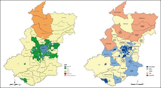 Diante desses dados, é possível verificar que o IVS mais baixo se estende entre os municípios que formam a Área de Concentração Populacional (ACP). Na outra extremidade, os valores mais altos de IVS são encontrados, predominantemente, nos municípios localizados na porção norte da RM de Curitiba. Na figura 6 visualiza-se os mapas da RM 2 e 3, respectivamente, com o IDHM e IVS metropolitano. Observa-se que os maiores IVSs e menores IDHMs estão localizados nos municípios marcados por insuficiências econômicas e sociais e, por consequência, com baixa prosperidade social e alto índice de pobreza.