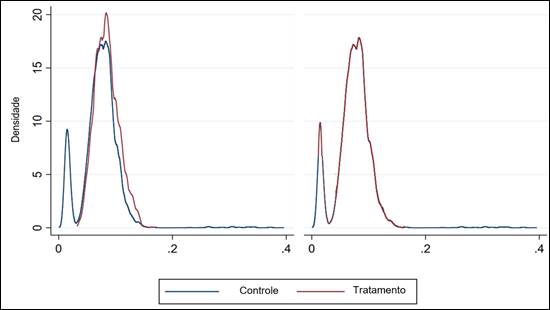 A Figura 1 apresenta no gráfico a esquerda a distribuição de probabilidade de participar do PBF antes do pareamento, enquanto no gráfico a direita, a distribuição após o pareamento. Podemos notar que o pareamento garante uma melhor sobreposição das curvas de densidade do escore de propensão dos grupos de controle e tratamento.