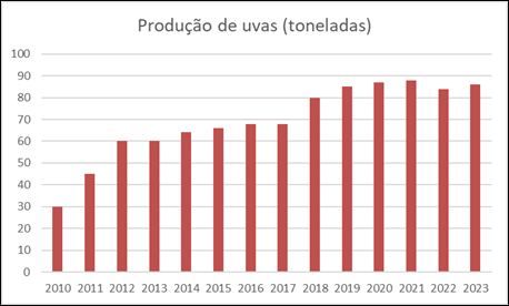 Gráfico 2 - Evolução da produção de uvas em toneladas no município de Curitibanos-SC no período (2010-2023)
