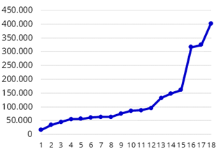 A RA média foi de R$ 123.000,00, com 12 casos abaixo desta média, refletindo também a concentração da renda agrícola conforme Figura 8 – Gráficos 1 e 2. Analisando a RA de todos os casos (Gráfico 1 – Figura 8), nota-se que 66,67% dos casos que detém renda agrícola abaixo da média respondem por 33,34% dessa renda, já os seis casos com RA acima da média concentram 66,67% da renda.