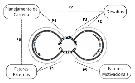 A forma que adquirem esses conhecimentos e habilidades depende da atitude do próprio profissional em relação ao interesse em aprender e adaptar-se. Os profissionais aprendem por meios diversos, como instituições de ensino, eventos e plataformas digitais, integrando aprendizados formais e informais. Nesse contexto, podem ser identificados os cenários no modelo proposto. O esquema teórico proposto explica que a construção do perfil profissional ocorre por meio da busca do aprendizado contínuo, integrando o aprendizado formal e informal, e as interações com as demais categorias desenvolvidas. O esquema teórico desenvolvido está limitado a um contexto específico.