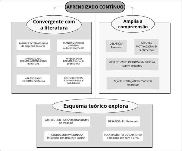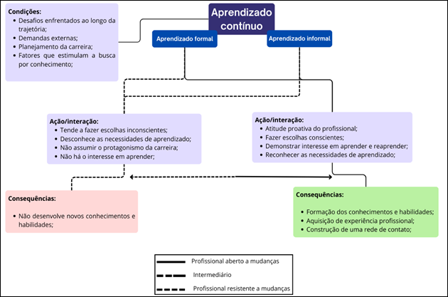 A categoria “aprendizado contínuo” representa o conjunto de ações/interações no processo de construção do perfil profissional, em resposta às condições apresentadas (Strauss; Corbin, 2008), as ações/interações são respostas reais que indivíduos ou grupos fornecem diante de um conjunto de circunstâncias. As principais ações realizadas pelos profissionais envolveram a busca pelo aprendizado em diferentes contextos, tanto em ambiente formal quanto o informal. Os pesquisados fizeram escolhas constantes para adquirirem conhecimento e se manterem atualizados, com interesse e aproveitando as oportunidades ao longo da carreira profissional.