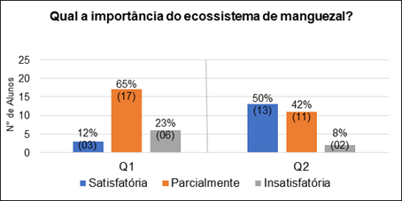 No primeiro questionário (Q1), ilustrado no gráfico 4, as respostas satisfatórias foram apenas 12%, sendo 65% parcialmente satisfatória e 23% insatisfatória. Dentre as respostas parcialmente satisfatória, destaca-se a resposta de um aluno que relatou que os manguezais são importantes “... pois tem muitos caranguejos que vivem lá”. Já no segundo questionário (Q2), ao final das atividades educativas, as respostas satisfatórias tiveram um aumento de 38%, o que consequentemente acarretou no decréscimo de 23% nas respostas parcialmente satisfatórias (15%). Ou seja, 50% dos alunos explicaram que: “...os manguezais são importantes para os animais que vivem lá, e também para as pessoas que dependem dele para se alimentar e sobreviver”. Isto é, metade da turma afirmou saber a importância da existência do ecossistema de manguezal.