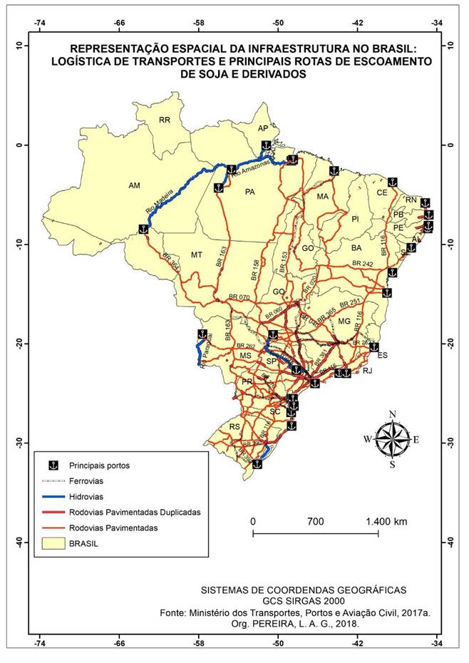 Considerando-se a infraestrutura da logística de transportes brasileira, as principais rotas para o escoamento da soja e derivados são: 1) Corredor de exportação Norte e Nordeste – transporte rodoviário pela BR 163; BR 158; BR 135; BR 364; BR 135 e BR 242. O transporte ferroviário pela Ferrovia Norte-Sul e Estrada de Ferro Carajás e o Transporte hidroviário pelas hidrovias do rio Madeira, Rio Amazonas e rio Tapajós. 2) Corredor de exportação Sudeste e Sul – transporte rodoviário pelas BR 158; BR 163; BR 262; BR 364; BR 365; BR 040; BR 050; BR 374; BR 376; BR 277; BR 392; dentre outras. O transporte ferroviário pela ferrovia América Latina Logística – ALL (malha sul); América Latina Logística – ALL (malha Norte e Paulista) e Valor da Logística Integrada – VLI. E as hidrovias do rio Tietê-Paraná, Hidrovia do Paraguai e Hidrovia da Lagoa dos Patos (MTPA, 2018a).