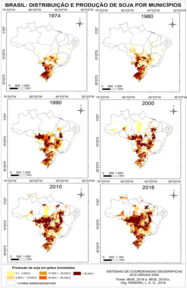 Na análise histórica da distribuição espacial da estrutura produtiva da soja em grãos nos municípios brasileiros é notória, na década de 1970, uma concentração nas municipalidades da região Sul, com início de expansão no sentido das denominadas áreas de novas fronteiras agrícolas. Nas décadas posteriores - 1980, 1990, 2000 e 2010 – a produção de soja cresceu nos municípios da região Centro-Oeste, bem como em áreas das regiões Sudeste, Nordeste e Norte, uma vez que receberam investimentos em infraestrutura, linhas de créditos e incentivos fiscais (Vide Mapa 03).