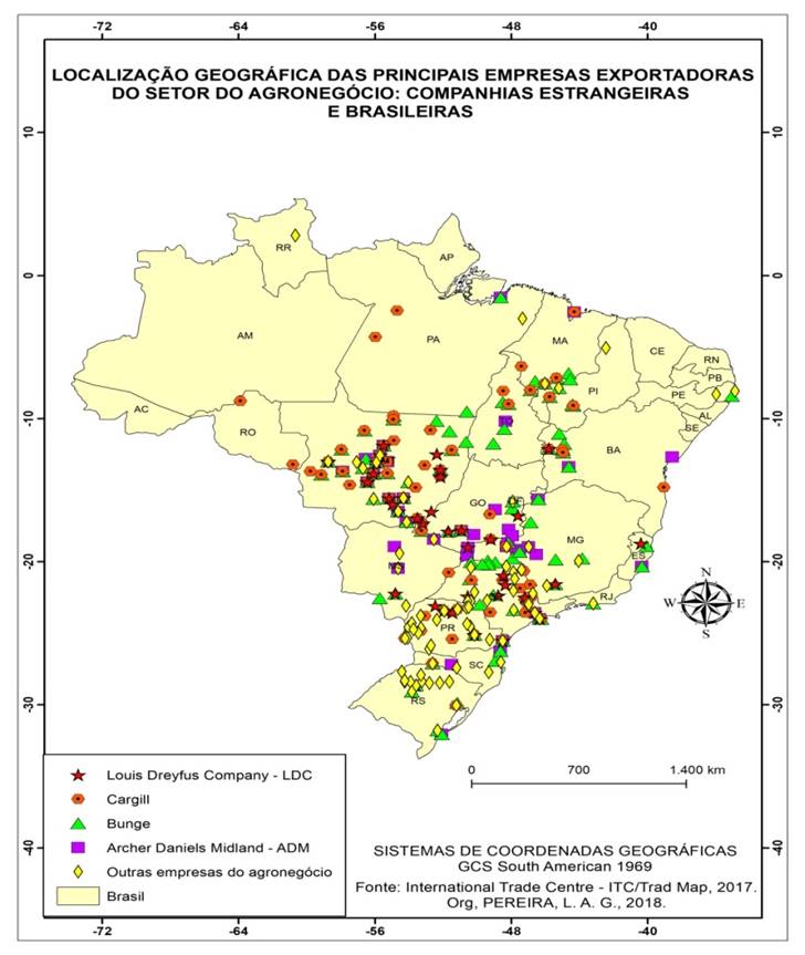 As principais trading companies estrangeiras que concentram as atividades de comercialização de soja e derivados, para atender as demandas do mercado externo e interno são a Archer Daniels Midland (ADM), a Bunge, a Cargill e a Louis Dreyfus Company (LDC). Além delas, existem também as empresas brasileiras – cooperativas e tradings – que são a Amaggi, a C. Vale – Cooperativa Agroindustrial e a COAMO Agroindustrial Cooperativa, dentre outras. O mapa 04 mostra a localização geográfica por domicílio fiscal no território brasileiro, das principais empresas do setor do agronegócio, que exportam a soja e os seus derivados para os mercados globais.