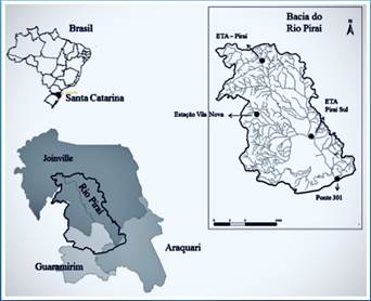 Figura 1 – Localização da cidade de Joinville no mapa do Brasil e de Santa Catarina. Abaixo, o mapa de Joinville e a localização do Rio Pirai. Ao lado, a Bacia do Rio Pirai, a localização do Bairro Vila Nova, local de residência dos participantes da pesquisa.
