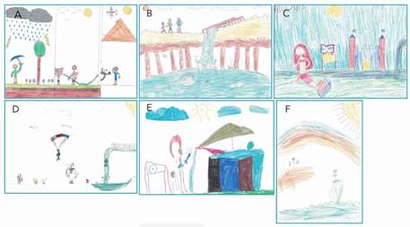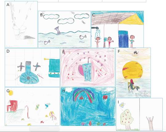 Figura 6 – Amostra dos desenhos que remetem a chuva como elemento importante para o abastecimento de oceanos, rios e cachoeiras: meninas e meninos entre 7 a 13 anos, residentes no Bairro Vila Nova, Joinville-SC