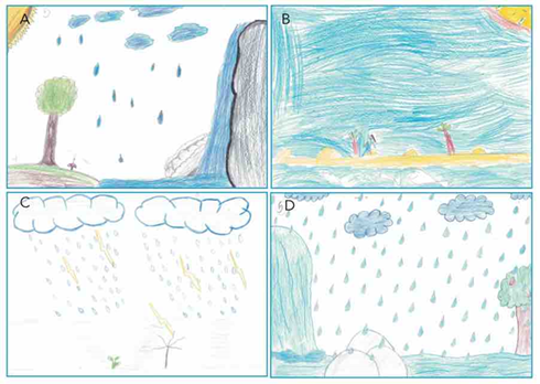 Nesta temática os alunos retratam a chuva como um elemento importante e representada em 40 desenhos (20,83%), abastecendo oceanos, rios, cachoeiras e nascentes, contribuindo para a vazão dos rios (Figura 6a; c) e para que os peixes, animais e plantas mantenham-se vivos (Figura 6b). Há situações em que a chuva é retratada em forma de temporal com relâmpagos (Figura 6c), o que pode ser explicado pela frequência com que esse tipo de fenômeno ocorre na cidade em que os jovens vivem, especialmente no verão. Sobre este tema foram identificados 22 desenhos de meninas e 18 de meninos.