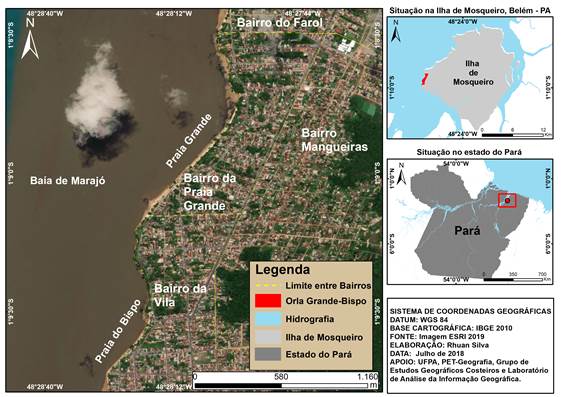 Mais especificamente, a orla Grande-Bispo localiza-se na porção sudoeste da ilha de Mosqueiro, margem leste da baía de Marajó, município de Belém, Pará, entre as coordenadas 1°08’ a 1°09’ de latitude sul e 48°27’ a 48°28’ de longitude oeste (Figura 1). Devido à posição geográfica, é uma área exposta a marés semidiurnas cujas amplitudes alcançam, no máximo, 3,9 m durante as sizígias de março, abril e setembro (BRASIL, 2018). Entretanto, há significativa atuação de ondas que podem atingir alturas de 1 m ou 1,5 m em condições de ventos do quadrante N-NE, mais fortes no período de julho a novembro. A orla é também influenciada por um regime pluviométrico sazonal com maior concentração de chuvas no trimestre de janeiro a março (PINHEIRO, 1987).