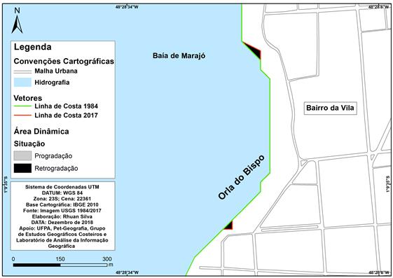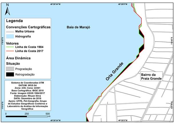 A comparação da posição da linha de costa, entre as imagens dos anos de 1984 e de 2017, revelou que na orla Grande, houve um recuo médio de 32 m (± 18,6 m, considerando o erro acumulativo das imagens para medidas lineares) com taxa de 0,9 m/ano. As áreas retrogradacionais totalizaram 13.500 m2 (± de 559 m2, considerando o erro acumulativo das imagens para medidas areolares), correspondendo a 70% dos setores submetidos à dinâmica costeira.