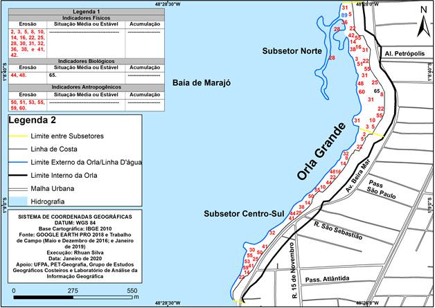 A distribuição espacial dos indicadores permitiu a divisão da orla Grande em dois subsetores: norte e centro-sul. No norte, que apresenta uma extensão de aproximadamente 650 m e uma largura entre 100 e 170 m, estão localizados 17 indicadores de erosão dos quais 7 têm peso 3. Isto é, 41% atestam erosão de alto grau.