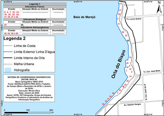 Ao relacionar esses valores de mobilidade da linha de costa com os dados referentes aos municípios de Soure e Salvaterra (FRANÇA; SOUZA FILHO, 2003) e Curuçá (RODRIGUES; SOUZA FILHO, 2011), é possível estabelecer os parâmetros que definem o grau da dinâmica. Tendo-se como indicador a variação da posição da linha de costa, considera-se como base de cálculo a taxa média de mobilidade máxima da linha de costa (avanço e recuo), no setor costeiro do Pará compreendido entre os municípios de Soure e Salvaterra (margem esquerda da baía de Marajó), orla Grande-Bispo (margem direita da baía de Marajó) e Curuçá (costa atlântica), que é de 53 m/ano. Assim, os graus de intensidade do fenômeno dinâmico de acumulação ou de erosão são determinados pelos seguintes parâmetros e pesos: (a) taxa anual inferior a 35,3 m/ano caracteriza baixo grau; (b) taxa anual de 35,3 a 70,7 m/ano indica médio grau; e (c) taxa anual superior a 70,7 m/ano aponta alto grau.