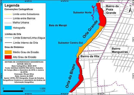 O estudo acerca da dinâmica costeira da orla Grande-Bispo, ilha de Mosqueiro, Belém-PA, revelou o predomínio da erosão, que se manifesta com intensidade desigual ao longo da área. A análise foi pautada na variação, distribuição e quantificação de indicadores, em duas escalas têmporo-espaciais (médio e curto período), seguido de representação cartográfica.