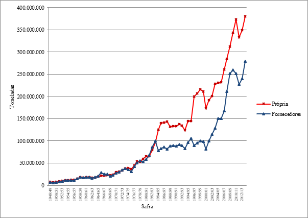 Já no período que corresponde aos anos de 1994 a 1998, a área plantada apresentou novo crescimento e passou dos 3.953.047 hectares plantados para 5.050.153, em 1998. Esse crescimento ocorreu, dentre outros fatores, devido à política econômica de controle da inflação e melhoria do cenário interno e externo, principalmente para a comercialização de açúcar. No caso do Brasil, outro fator que influenciou foi o aumento do consumo de etanol anidro, que passou a ser adicionado à gasolina. O começo da década de 1990 também foi marcado pela desregulamentação no setor. Na Figura 01, pode-se visualizar a evolução da produção de cana-de-açúcar, própria e de fornecedores – safra 1948/1949 a 2013/2014.