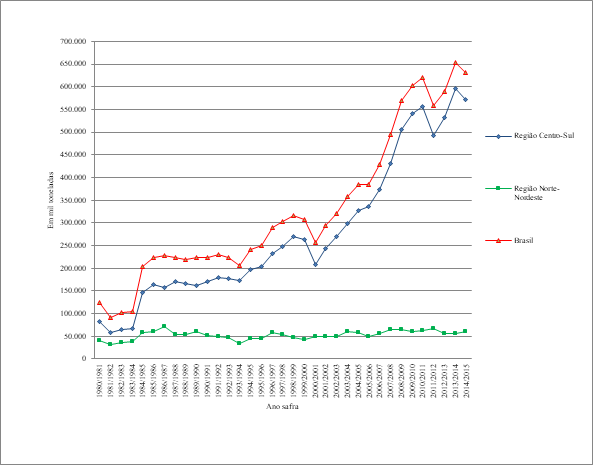 No que diz respeito à quantidade de cana-de-açúcar produzida, segundo dados da UNICA, o Brasil produziu, na safra 2015/2016, cerca de 658,7 milhões de toneladas. No que diz respeito à produção de etanol total, ela consolidou-se em 28,66 bilhões de litros na safra 2014/2015. Na Figura 02, pode-se observar a evolução da quantidade de cana-de-açúcar processada entre as safras 1980/1981 a 2014/2015.