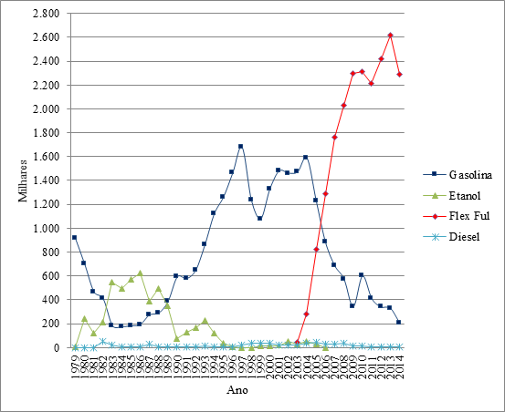 Figura 03 – Brasil - Produção de automóveis por tipo de combustível – 1979-2014