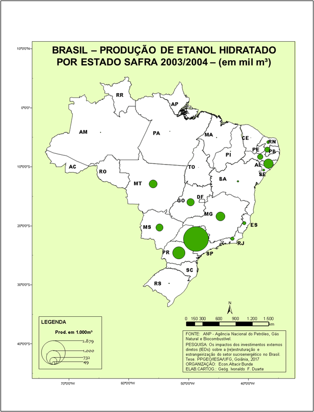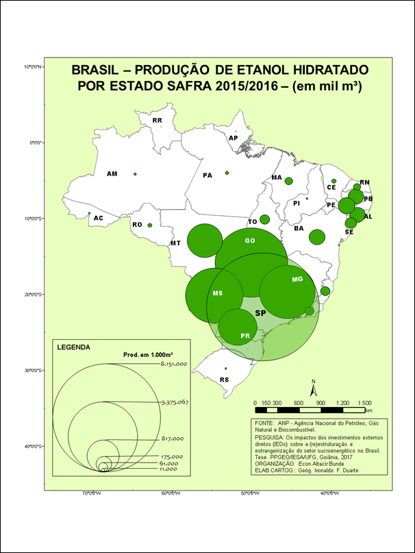 Um dos fatos importantes a ser observado na produção de etanol hidratado diz respeito à participação dos estados da Região Norte-Nordeste na produção total. Estes, que respondiam por 17,59% na safra 2003/2004, caíram para apenas 5,33% na safra 2015/2016. Desse modo, a expansão da produção dessa mercadoria ocorreu no Centro-Sul do país, com destaque para os estados de São Paulo, Goiás, Minas Gerais e Mato Grosso Sul. Tais estados se tornaram os principais produtores de etanol hidratado, assim como, em alguns deles, os principais consumidores.