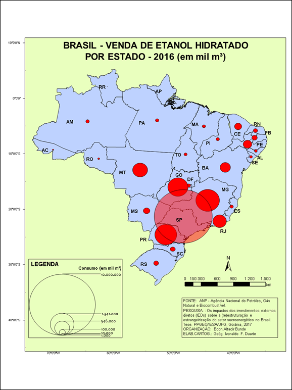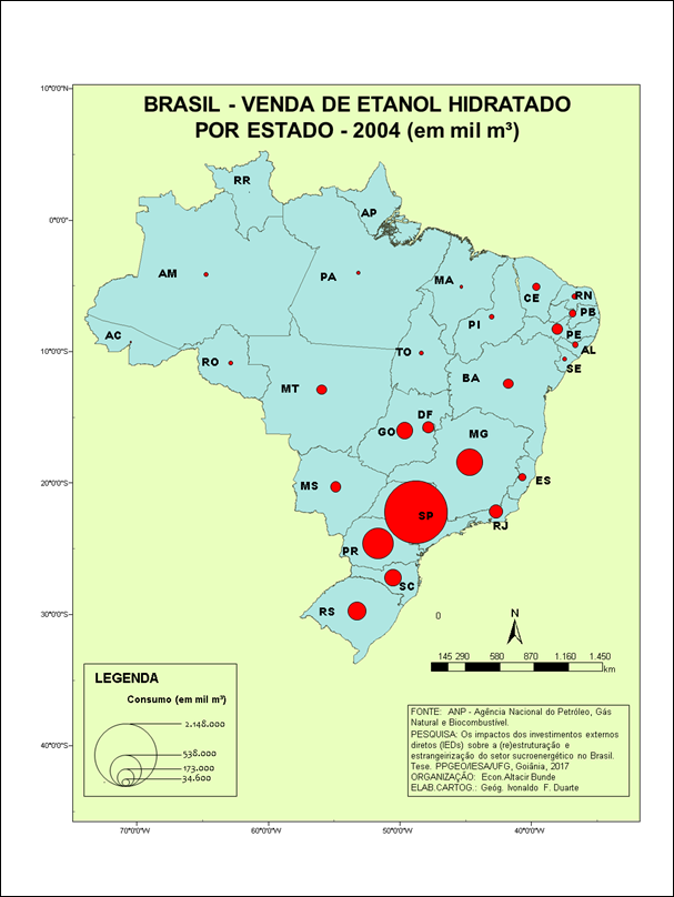 A produção e o consumo de etanol abrangem parte de um sistema que ocorre de forma concentrada em uma determinada fração do território, o Centro-Sul do Brasil, que tem o estado de São Paulo como o maior produtor e consumidor dessa mercadoria. Portanto, é nessa fração do território que ocorre a produção e a realização da renda da terra e, por consequência, sua apropriação por parte do capital nacional e internacional.