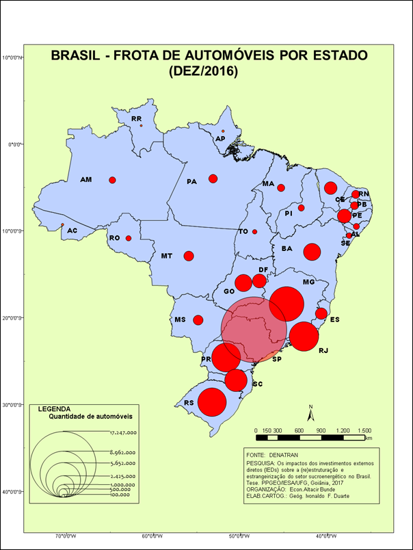 Já em 2016, segundo dados do Ministério das Cidades, do Departamento Nacional de Trânsito (DENATRAN) e do Registro Nacional de Veículos Automotores (RENAVAM), a frota que, em 2004, era de 23.757.230, saltou para 51.296.982, em dezembro de 2016. Assim, no período, a frota nacional de automóveis mais que dobrou, conforme pode ser observado comparando-se as Figuras 08 e 09.