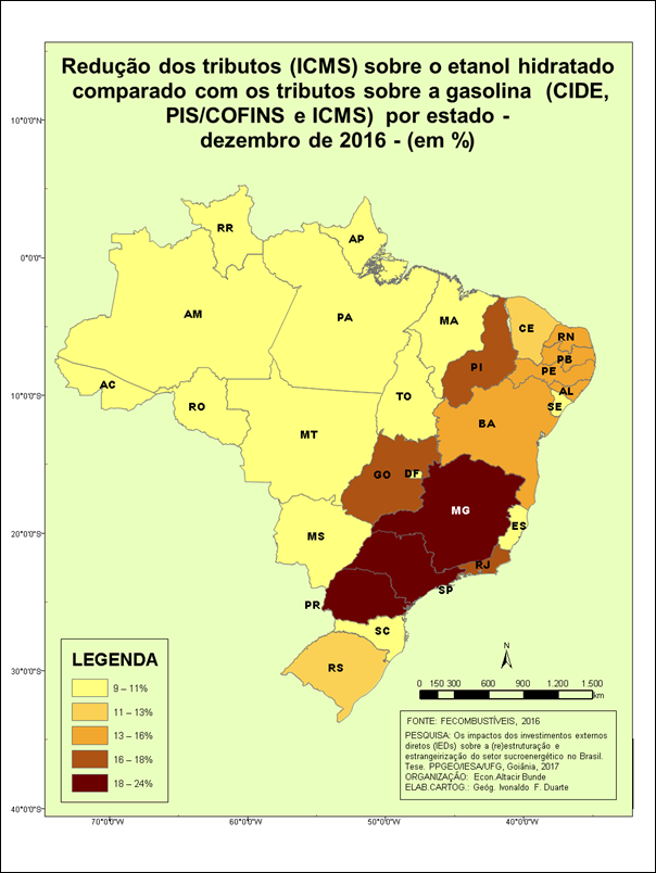 A partir daí, foi criado o mercado de etanol hidratado no Brasil, concentrado na região Centro-Sul, com destaque para o estado de São Paulo. A título de ilustração, pode-se observar, na Figura 11, a redução do tributo (ICMS) sobre o etanol hidratado comparado com os tributos sobre a gasolina (CIDE, PIS/COFINS e ICMS) por estado, em dezembro de 2016 (em %).