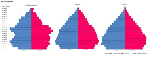 Figura 3 — Pirâmides Etárias de Boa Esperança, do Paraná e do Brasil (2010)