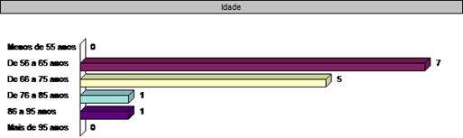 Quanto à faixa etária (Gráfico 03), 7 (50%) pessoas têm entre 56 e 65 anos, 5 (36%) entre 66 e 75 anos, 1 (7%) entre 76 e 85 anos e 1 (7%) entre 86 e 95 anos. Não tivemos nenhum caso com menos de 55 anos ou mais de 95 anos. Quanto ao estado civil, 12 (86%) são casados, 1 (7%) vive em união estável e 1 (7%) é viúvo.
