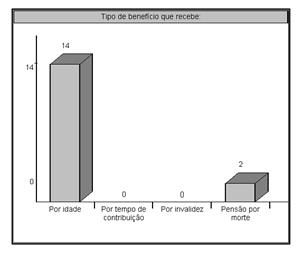 Em relação à idade em que passaram a receber o benefício, todas as mulheres informaram 55 anos, exceto uma aposentada que recebeu auxílio doença dos 50 aos 55 anos, quando passou a receber a aposentadoria rural. Já os homens, todos afirmaram ter se aposentado aos 60 anos. No que diz respeito ao tipo de benefício que recebem (Gráfico 08), dos 14 participantes, 100% afirmaram receber por idade. Desses 14, encontraram-se 2 casos que, além de seu benefício, recebem pensão por morte do cônjuge (ambos os casos o esposo quem faleceu). Esses dados mostram a importância da aposentadoria rural especial por idade, pois é facultativo ao agricultor realizar contribuições ao INSS (é muito raro casos em que a contribuição ocorre).