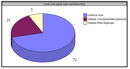 Com o intuito de avaliar o impacto da aposentadoria rural especial na dinamização do comércio local no município de Boa Esperança, realizaram-se algumas questões sobre o tema. Questionou-se aos aposentados participantes da pesquisa onde gastam a maior parte do benefício recebido. Como respostas, constatou-se que a grande maioria 10 (72%) gastam no comércio local, 3 (21%) gastam em cidades vizinhas (Juranda e Goioerê, também de porte pequeno) e 1 (7%) em cidades polos regionais, no caso Campo Mourão (Gráfico 11). Também questionou-se qual seria o motivo da preferência em gastar no comércio local, ou em cidades vizinhas, ou em cidades polos regionais. Sendo uma questão que permitia várias respostas, obteve-se o seguinte resultado: por ser o local mais próximo (11 respostas), porque conhece e/ou confia nos comerciantes (4 respostas), porque oferecem crédito (3 respostas), porque tem melhor preço (4 respostas), porque os produtos têm mais qualidade (1 resposta), outros motivos (1 resposta).