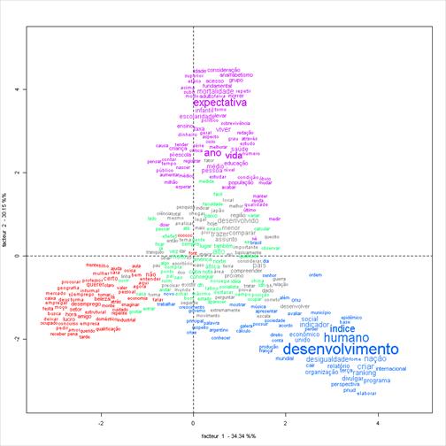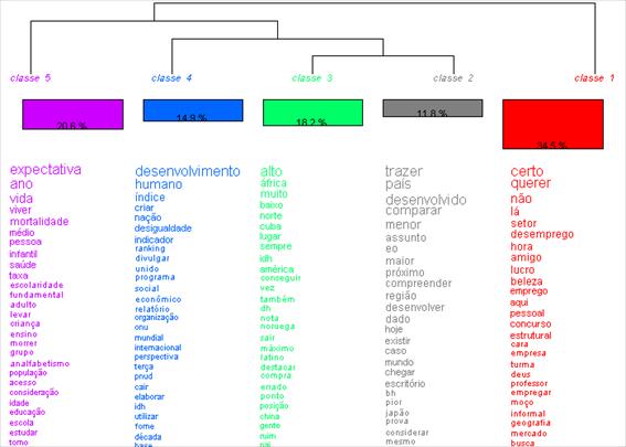 O gráfico da Figura 1apresenta a distribuição das palavras faladas por uma classificação de 5 classes de enunciados sendo: 1) falas sobre expectativa de vida; 2) falas sobre o desenvolvimento humano; 3) falas de exemplos geográficos; 4) falas sobre comparações geográficas; 5) falas figuras de estilos e de linguagem usadas pelos professores. No gráfico da Figura podemos ver como essas classes se relacionam e suas forças no contexto. Podemos perceber que desenvolvimento e expectativa de vida tem mais presença e força nos enunciados.