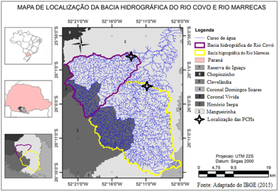 No período de um ano e meio foram estudadas duas PCHs do município de Mangueirinha, no Sudoeste do Paraná. Ambas as PCHs estudadas localizam-se na bacia hidrográfica do Rio Iguaçu. Sendo que a PCH Canhadão, localiza-se na sub-bacia do Rio Covó, e a PCH Tigre situa-se na sub-bacia do Rio Marrecas como pode-se ver a localização através da Figura 1.