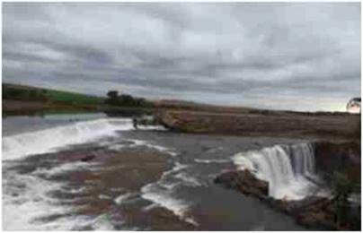 Figura 21 – Barramento e desvio construídos, com plantações a sua margem esquerda e queda d’água natural a jusante.