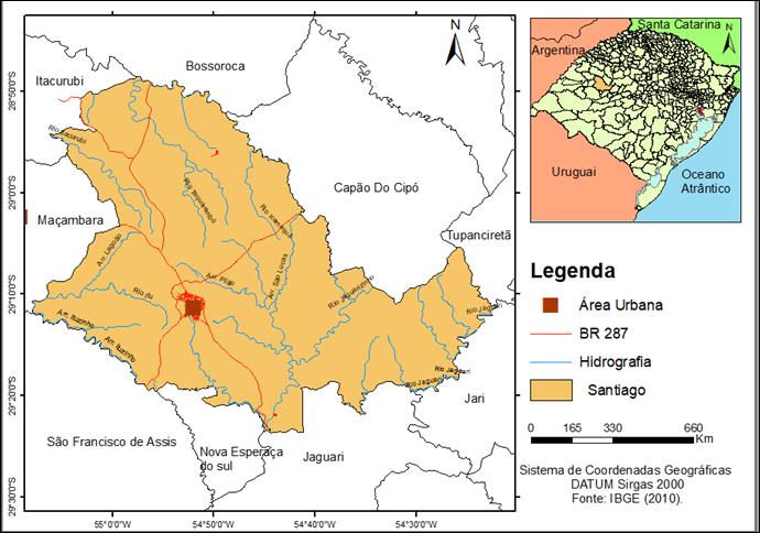 O objetivo deste trabalho é caracterizar o relevo do município de Santiago, com o apoio de atributos topográficos obtidos de um Modelo Digital de Elevação (MDE), visando desenvolver técnicas que ofereçam suporte aos trabalhos de mapeamento geomorfológico com maior rapidez e reduzam os custos dos levantamentos. Santiago localiza-se a uma latitude de 29º 11’ 30’’ sul e a uma longitude de 54º11’ 30’’ oeste , estando a uma altitude de 409, está situada a 363,6km da capital do estado, Porto Alegre, na região Centro- Oeste do Rio Grande do Sul (figura1). O município tem 2.413,075 km2 de extensão territorial e, de acordo com o senso 2010, conta com uma população de 49.082 pessoas e uma densidade demográfica de 20 hab/ km2.